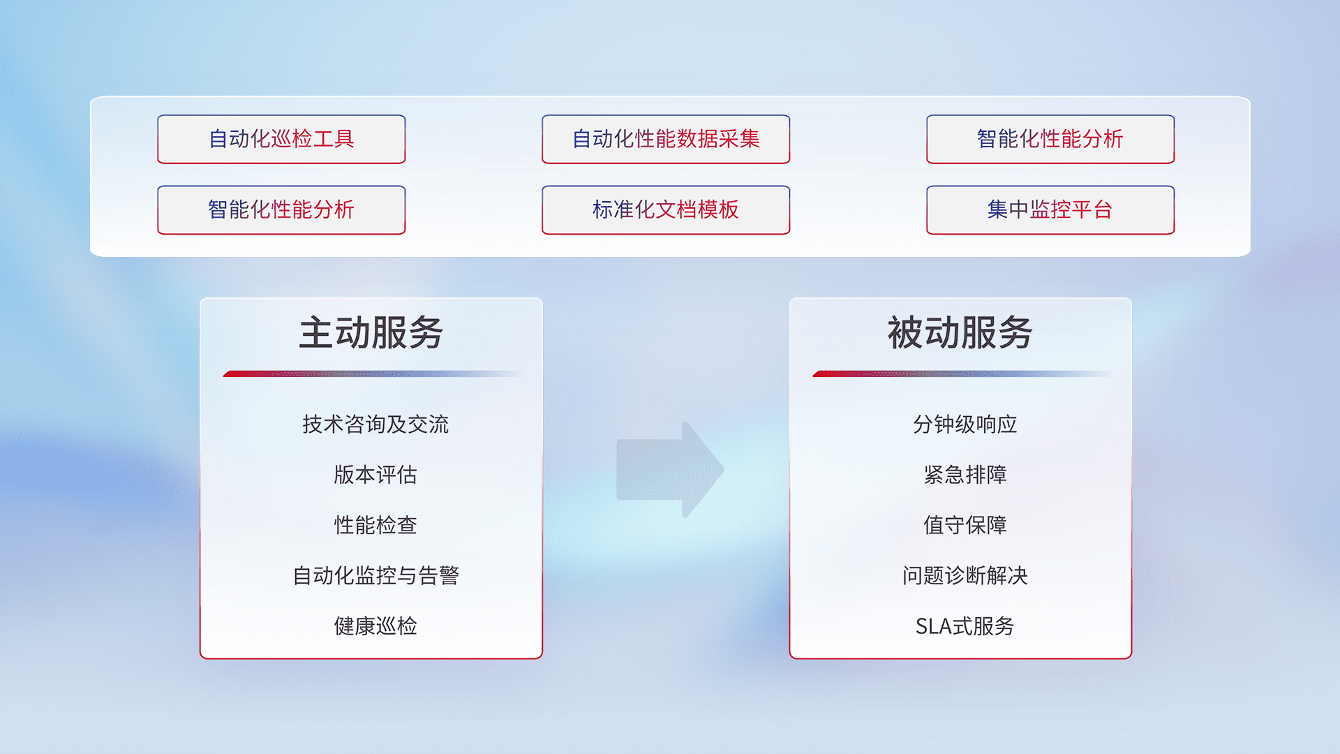智能化工具和标准化文档,,,保障服务质量,,提供主动服务(包含技术咨询、、、版本评估、、、、性能检查、、、自动化监控与告警、、健康巡检)和被动服务包含(分钟级响应、、、紧急排障、、、、值守保障、、、、问题诊断解决、、、SLA服务)。。。。